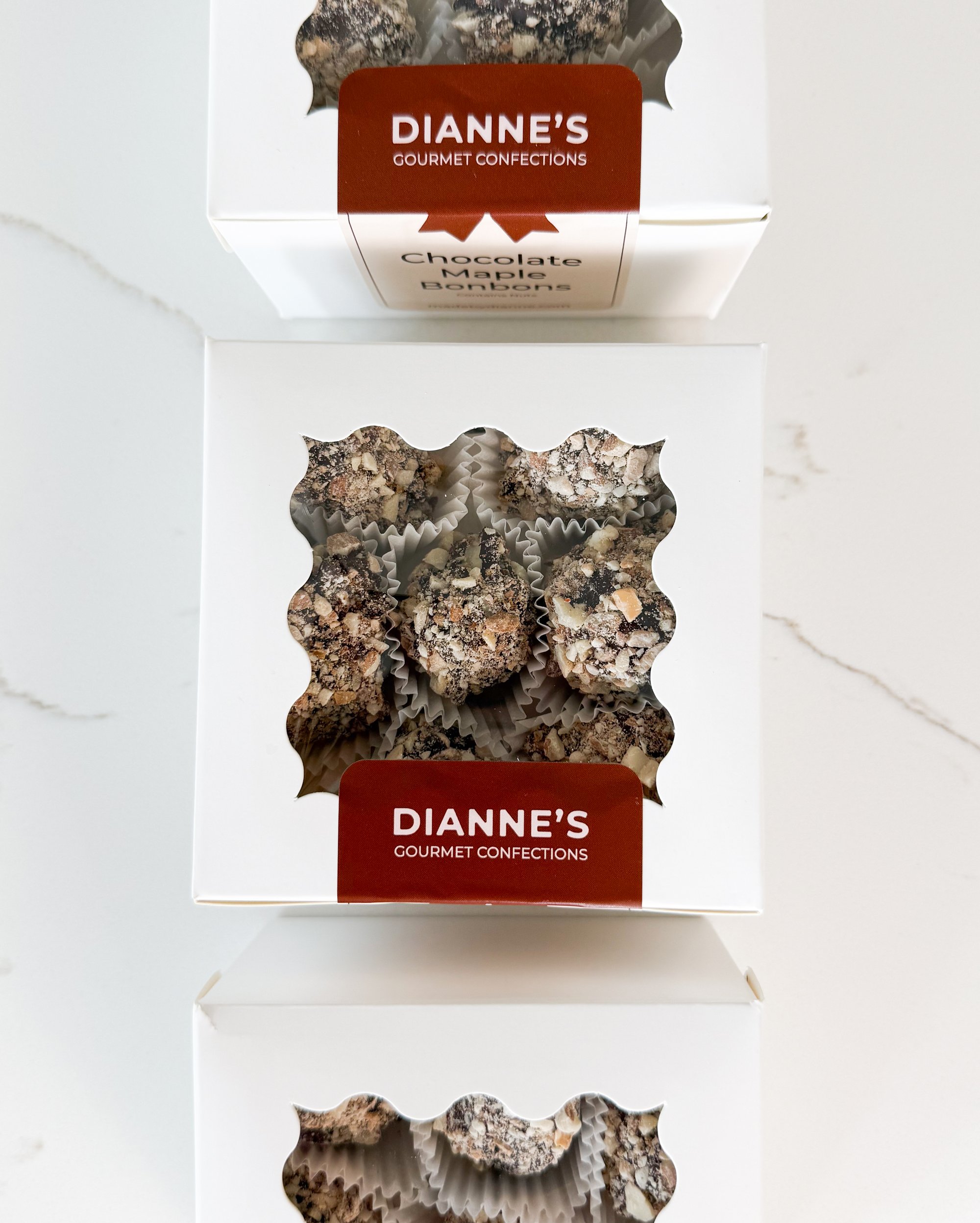 A smooth dark chocolate shell filled with a creamy maple center and rolled in finely chopped almonds. These bonbons are rich without being too sweet, with a warm maple flavor that feels cozy and familiar.