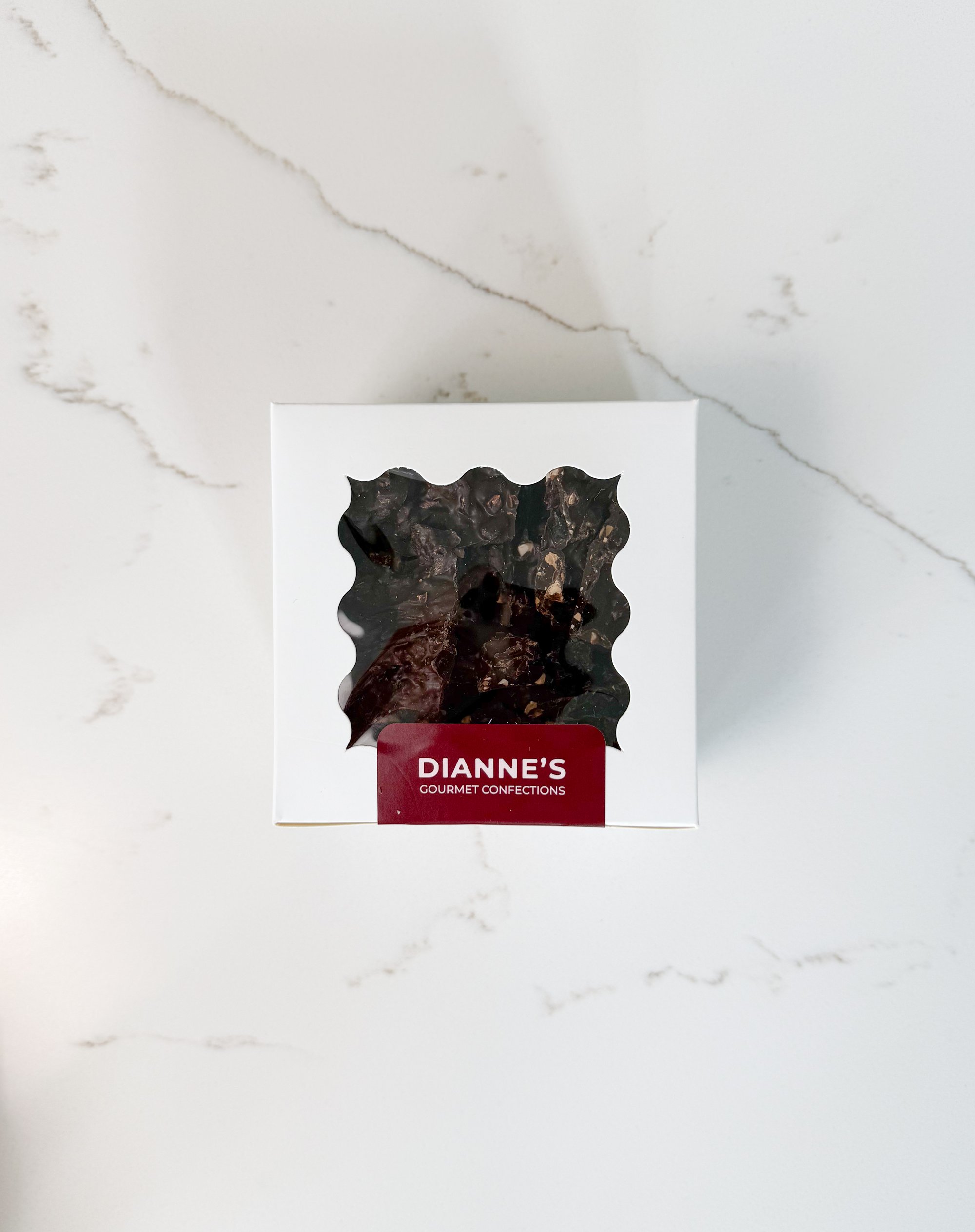 Rich dark chocolate layered with roasted almonds and dried cranberries for a mix of deep chocolate flavor, crunchy texture, and just a touch of tart sweetness. Each batch is poured and finished by hand, so no two pieces are exactly alike.